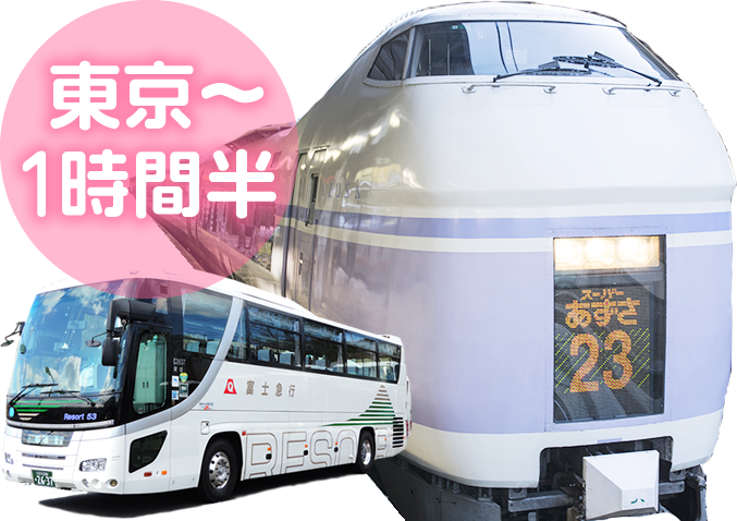 ・都内~車で2時間・電車で1時間40分・高速バスで1時間50分(バスタ新宿)