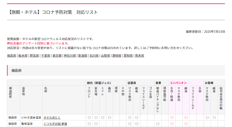 そこで当社としては、そうした対策をわかりやすく示すため、コンパニオン宴会プランが活発なお宿について、 【コロナ予防対策】旅館・ホテル 対応リスト (弊社調べ)を掲載しております。