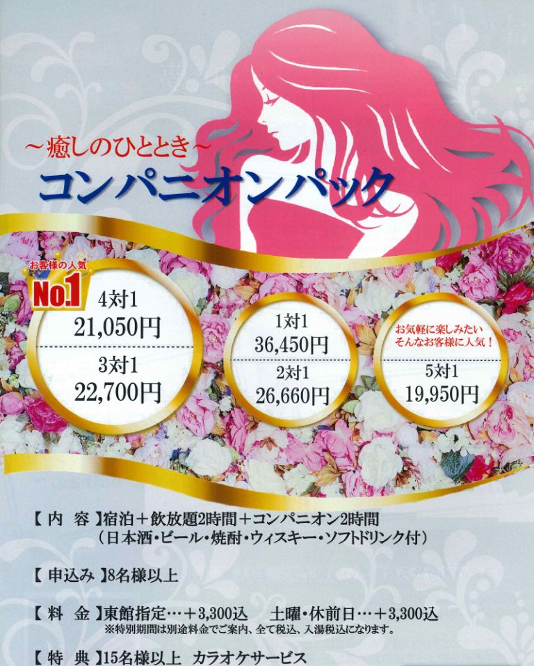 ノリが良く可愛いコンパニオンがお酌をしたり、楽しい会話で宴会を盛り上げます。2次会プランも充実しています。